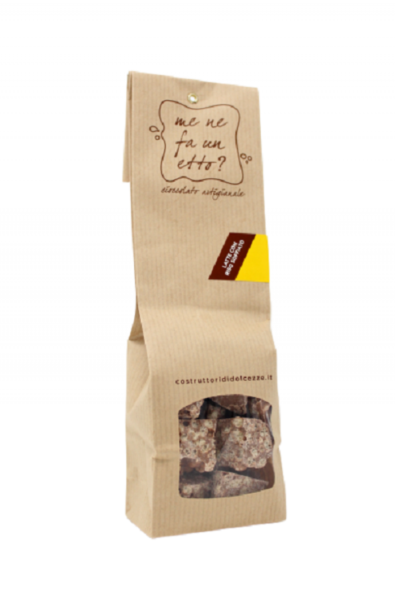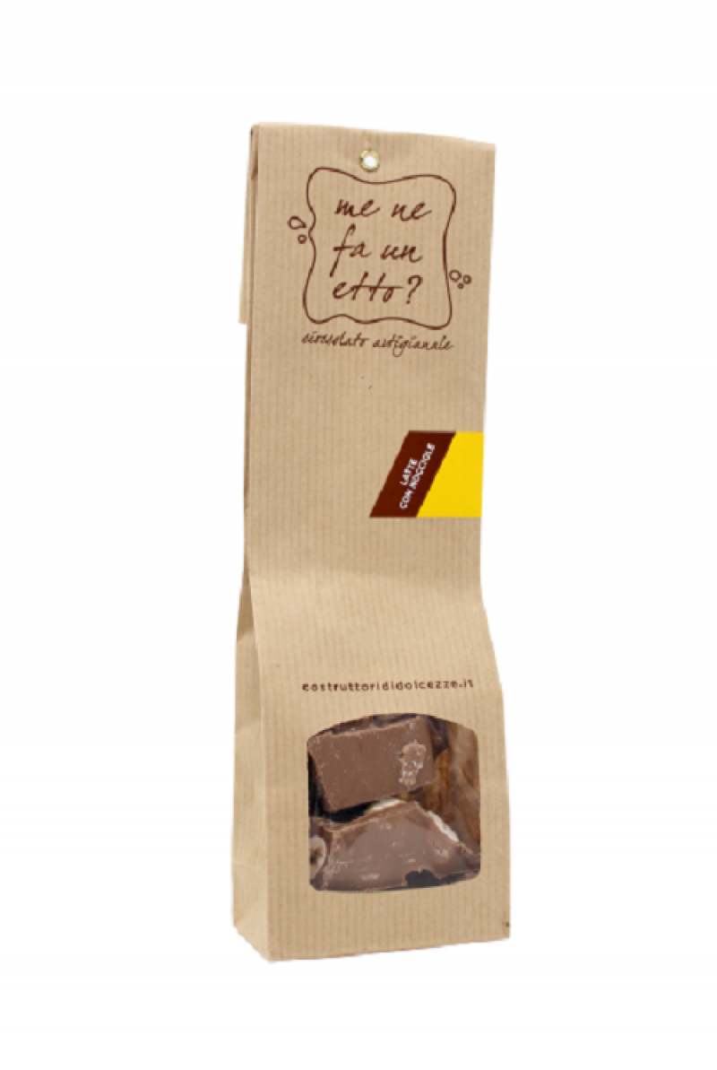 Ingredienti: zucchero, burro di cacao, latte in polvere, nocciole 20%, pasta di cacao, emulsionante: lecitina di soia; aroma naturale di vaniglia.